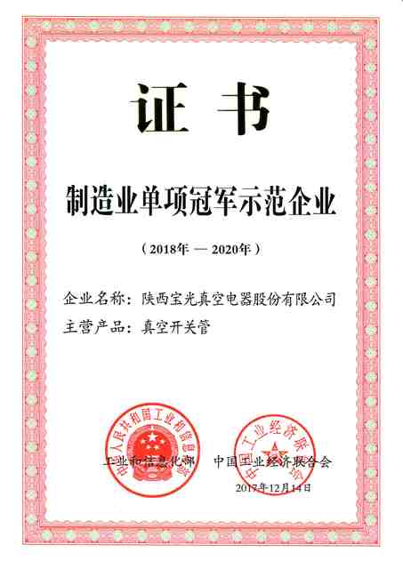 2017年12月工業和信息化部、中國工業經濟聯合會聯合公布了第二批制造業單項冠軍企業和單項冠軍產品名單,寶光股份作為陜西地區上榜的唯一一家制造企業,以全球產銷量最大的真空滅弧室制造企業榮獲“國家第二批制造業單項冠軍企業”稱號。2018年1月22日,由工信部和工業經濟聯合會在北京舉行了頒獎大會,企業管理與信息化部部長趙宏參會并上臺領獎。