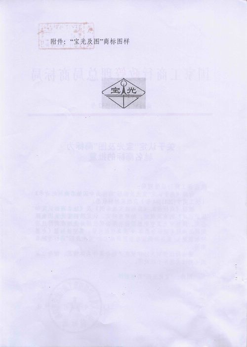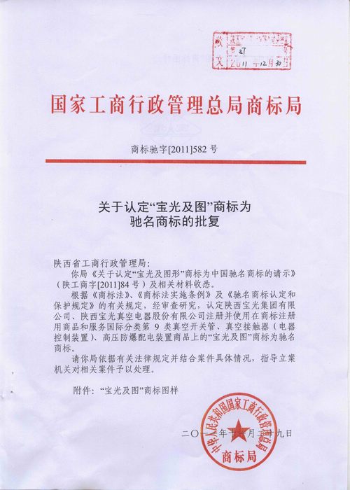 “寶光” 牌注冊商標(圖形+文字)       被中華人民共和國國家工商行政管理總局商標局認定為“中國馳名商標”,于2011年11月29日正式下發了《關于認定“寶光及圖”商標為馳名商標的批復》(商標馳字【2011】582號)文件)。
