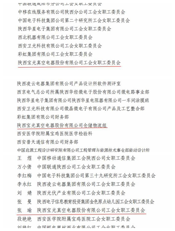 近日,從陜西省國(guó)防工會(huì)傳來(lái)喜訊,陜西寶光真空電器股份有限公司工會(huì)委員會(huì)女職工委員會(huì)被授予“陜西省國(guó)防工會(huì)先進(jìn)女職工委員會(huì)”榮譽(yù)稱(chēng)號(hào),生產(chǎn)管理處倉(cāng)儲(chǔ)物流組被授予“陜西省國(guó)防科技工業(yè)五一巾幗標(biāo)兵崗”,工會(huì)辦公室張瑜同志被評(píng)為“陜西省國(guó)防工會(huì)先進(jìn)女職工干部”榮譽(yù)稱(chēng)號(hào)。