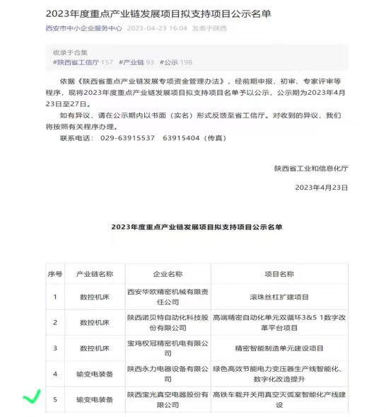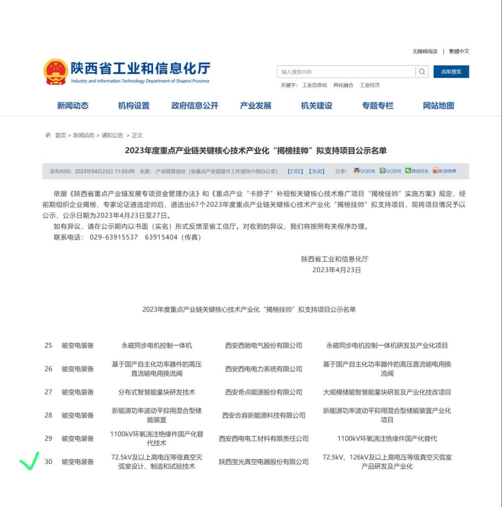 通過認真籌備、資料審核及現場答辯,由公司組織申報的“72.5kV、126kV及以上高電壓等級真空滅弧室產品研發及產業化”項目與“高鐵車載開關用真空滅弧室智能化產線建設”項目分別中榜陜西省工信廳2023年關鍵核心技術產業化“揭榜掛帥”項目與重點產業鏈發展項目,并已進入公示階段。